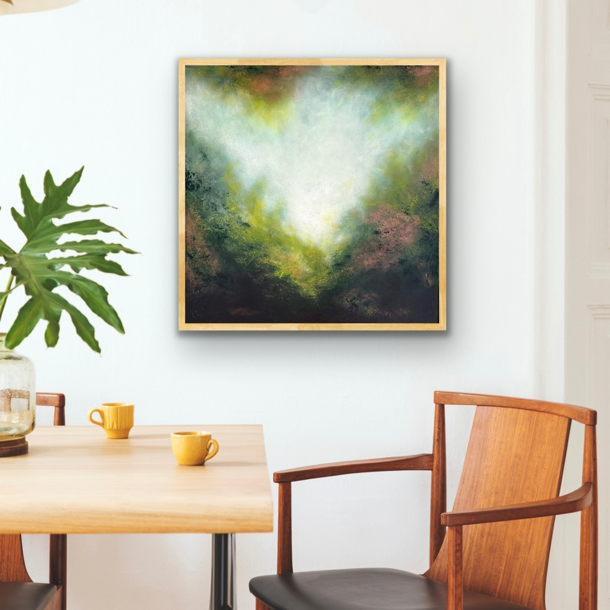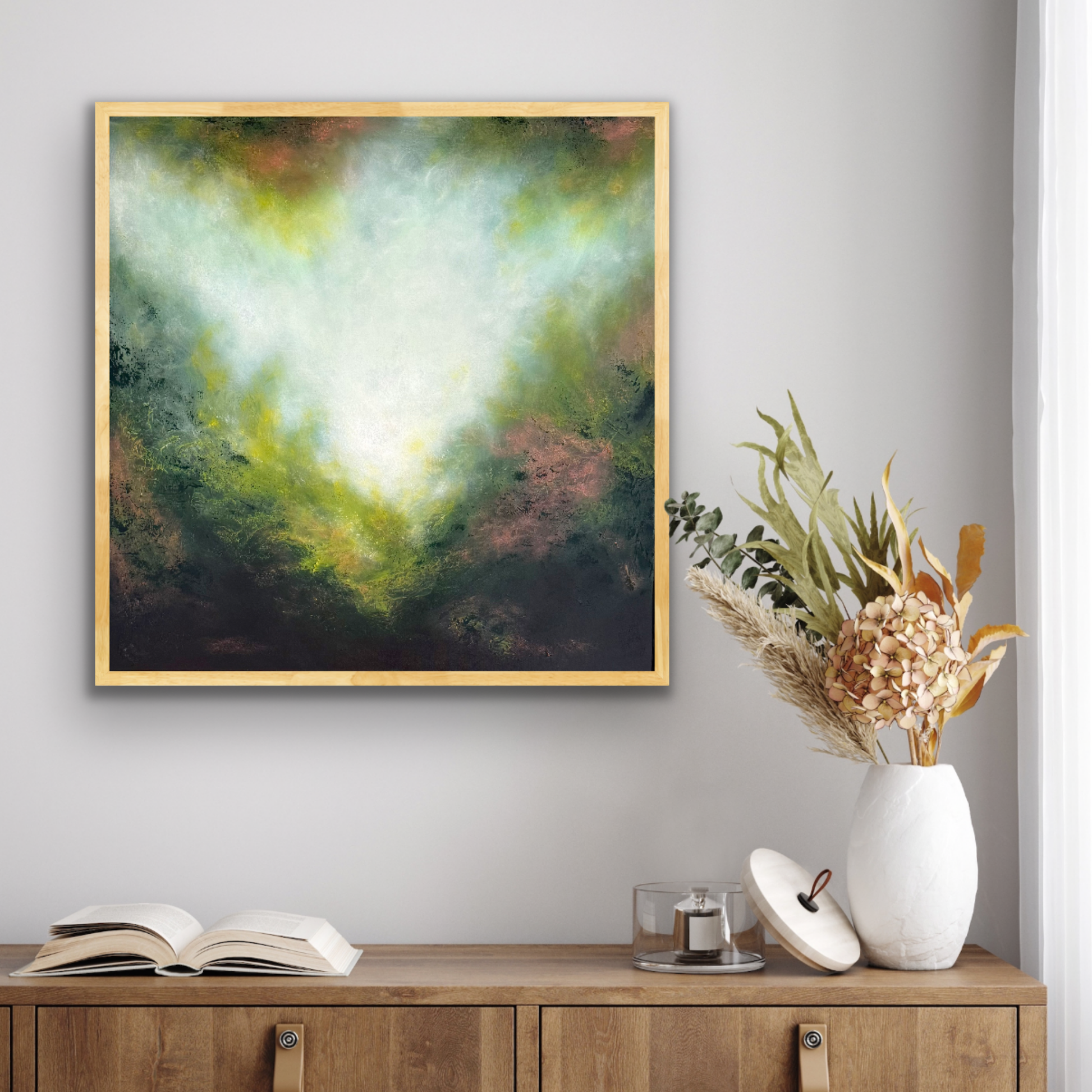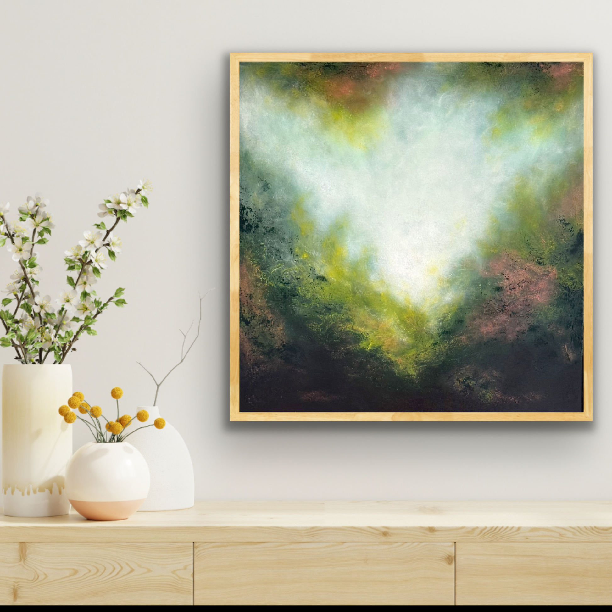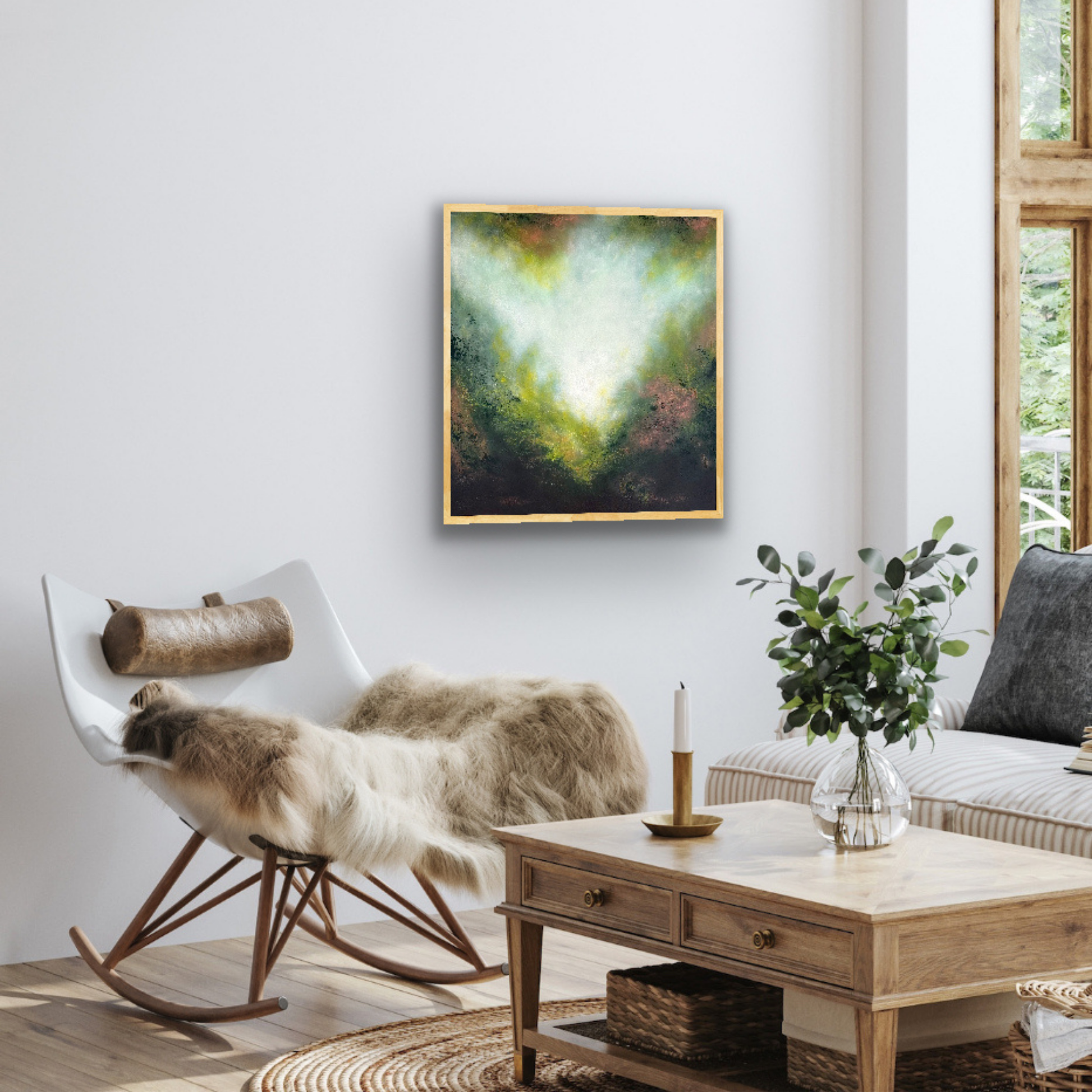 Radiant and expressive, Golden Wattle captures the dreamy glow of light breaking through foliage. Soft washes of white and pale gold radiate outward, blending into rich greens and earthy undertones, creating a luminous sense of movement and depth.