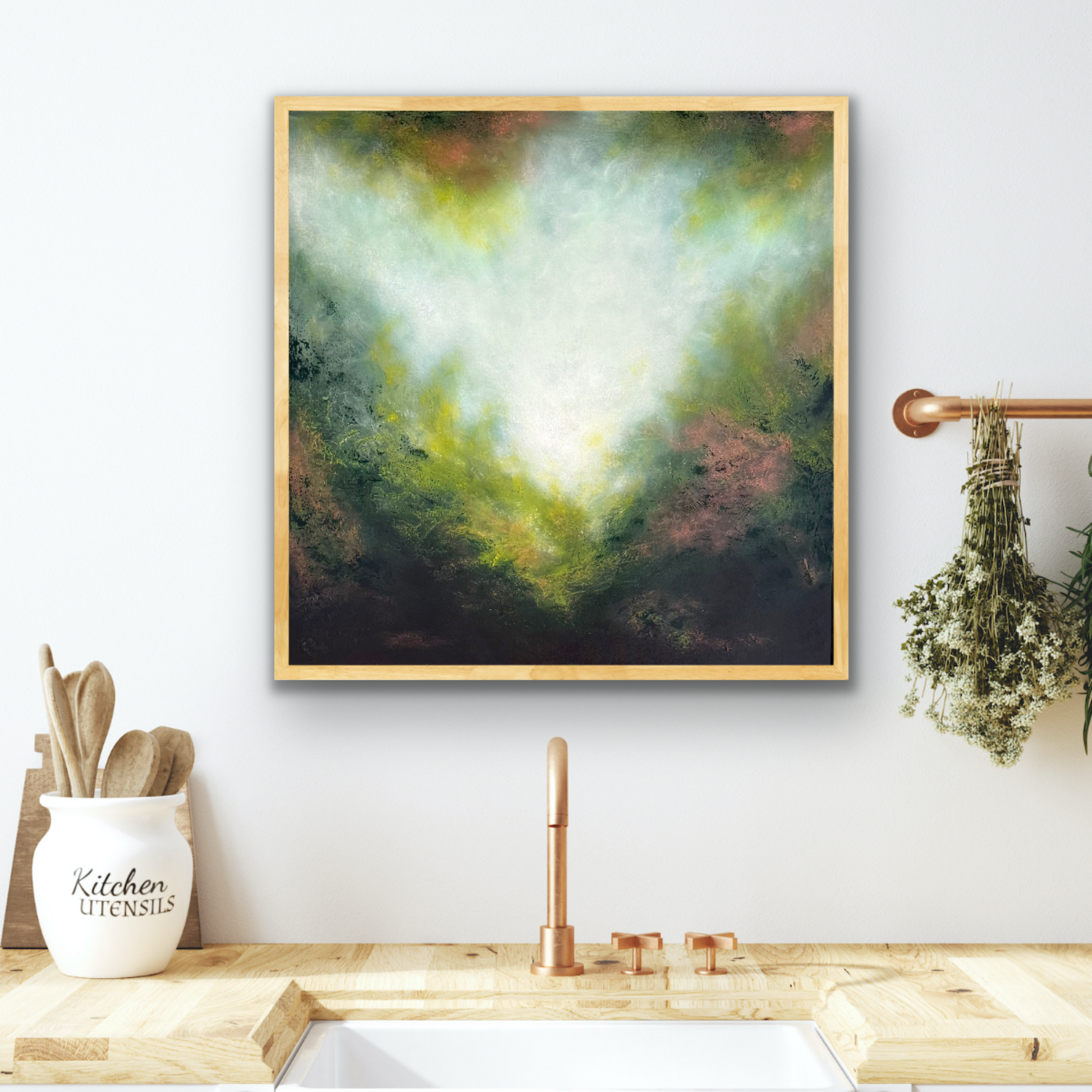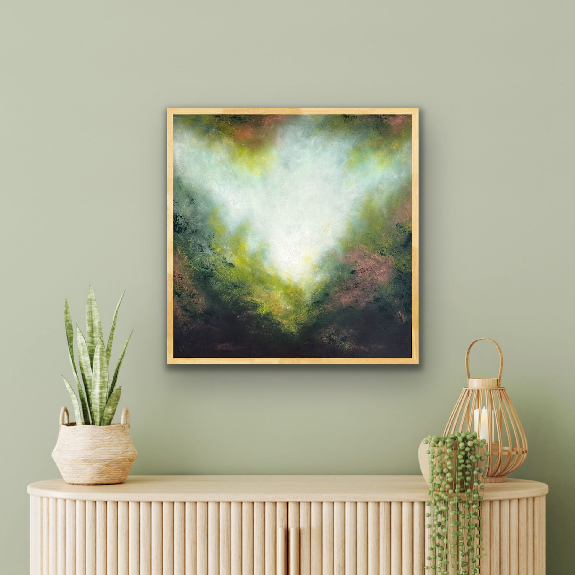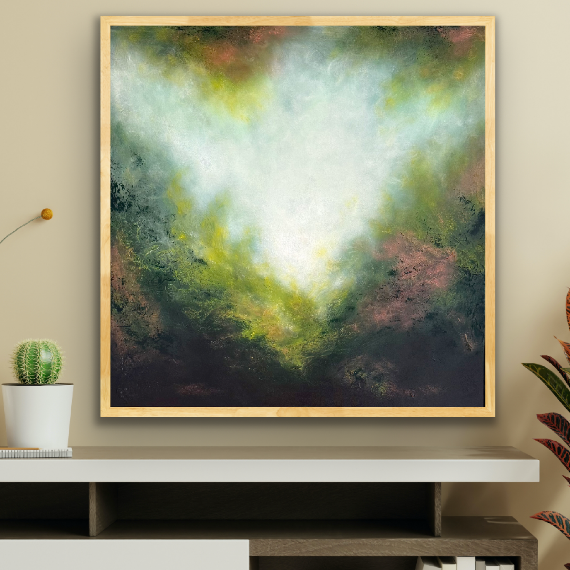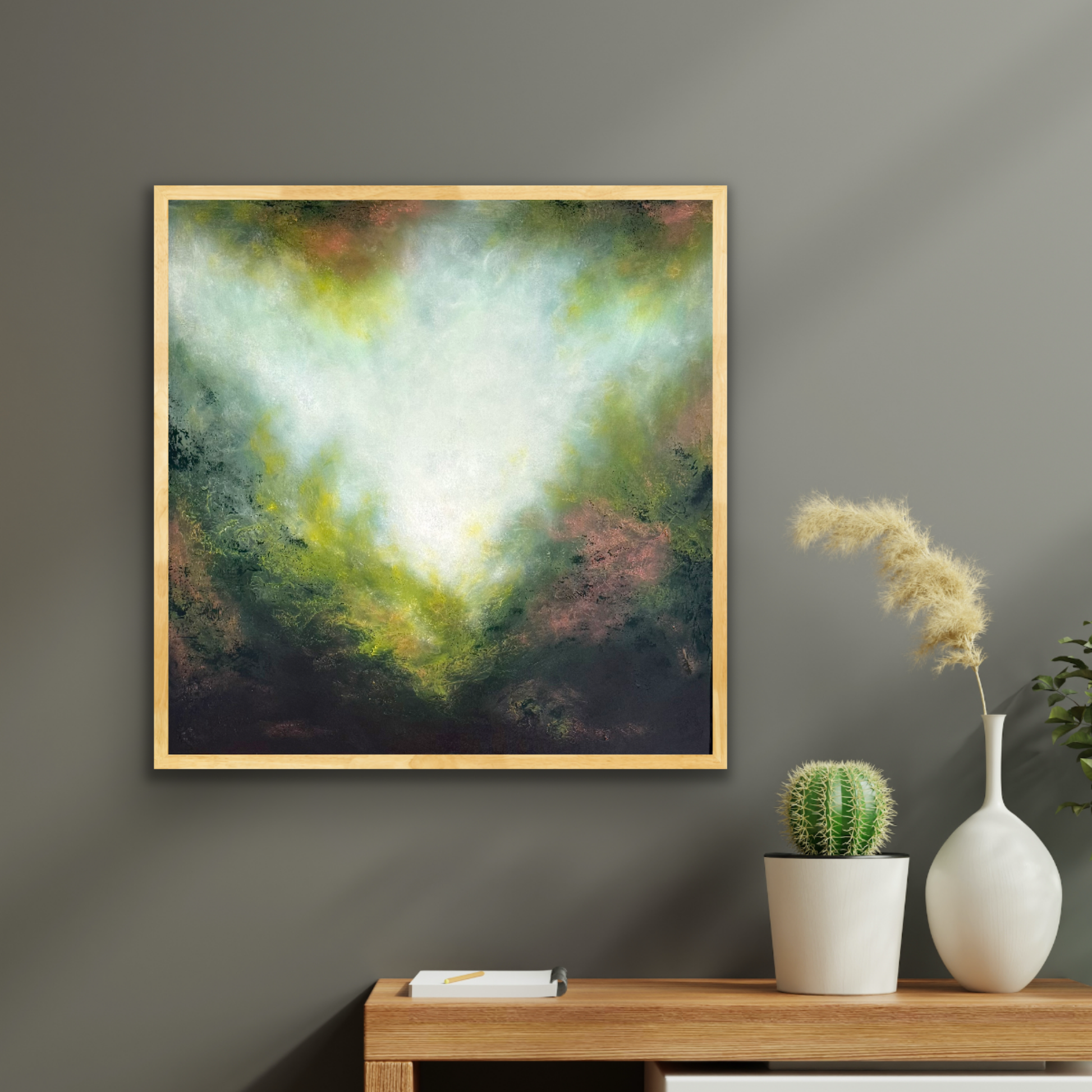 Radiant and expressive, Golden Wattle captures the dreamy glow of light breaking through foliage. Soft washes of white and pale gold radiate outward, blending into rich greens and earthy undertones, creating a luminous sense of movement and depth.