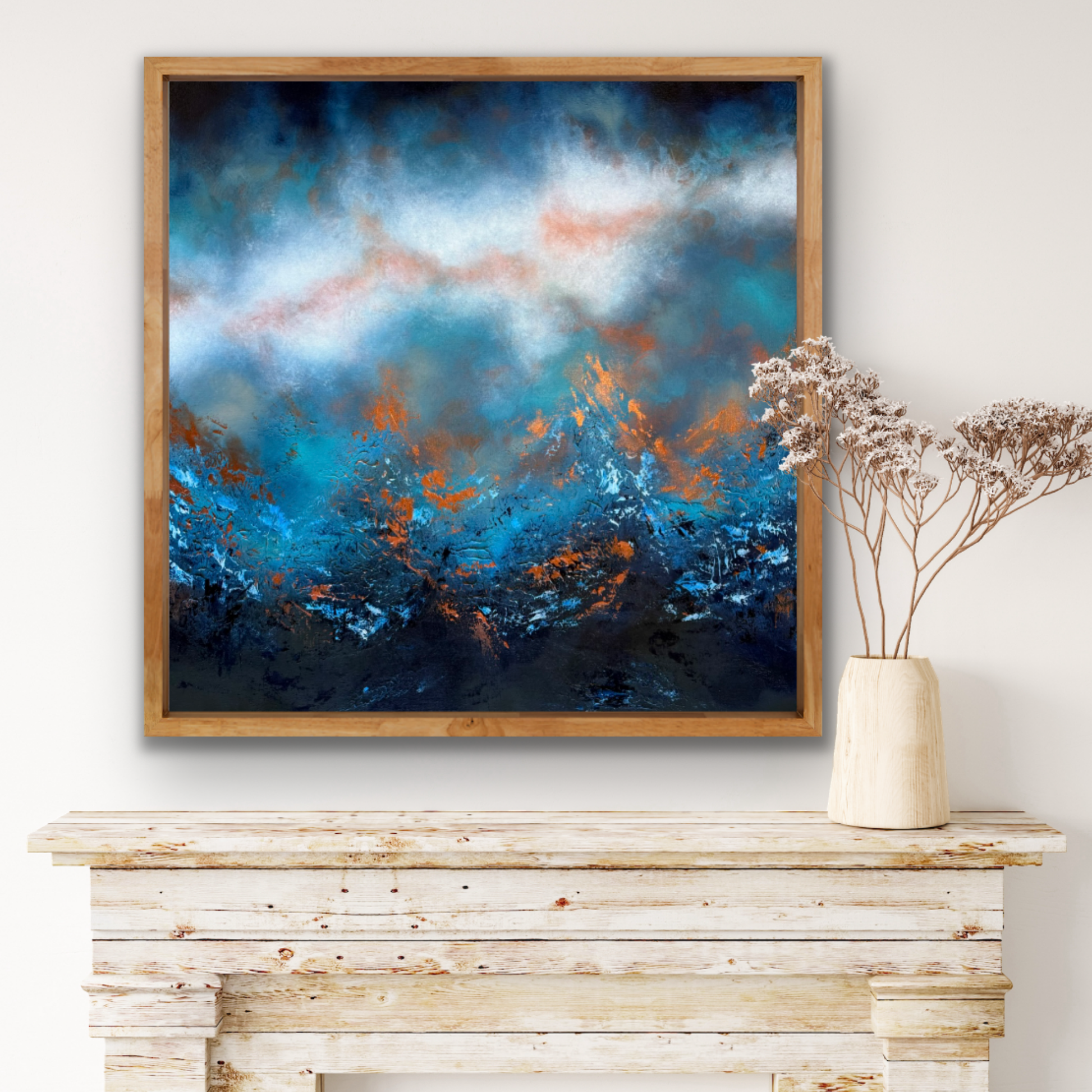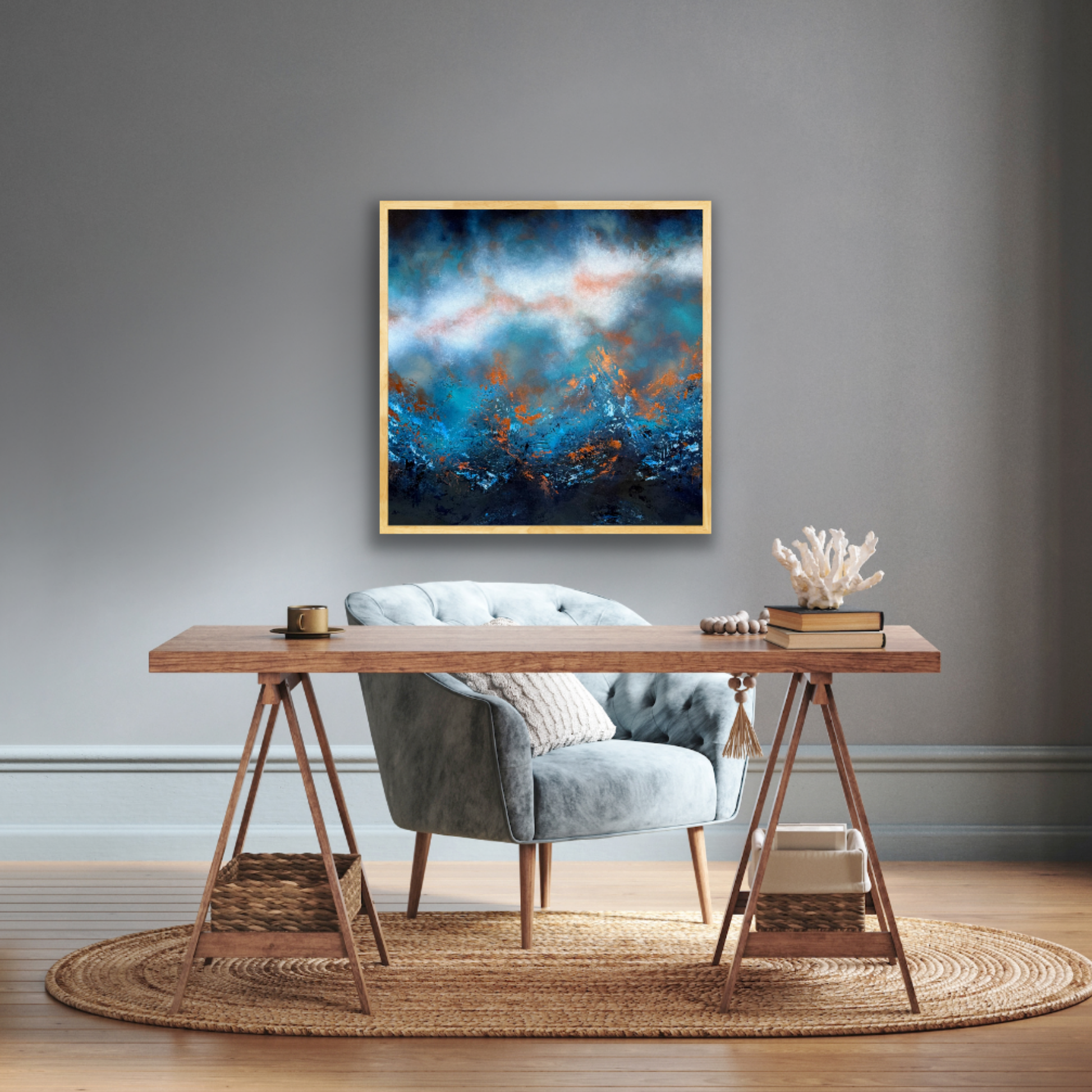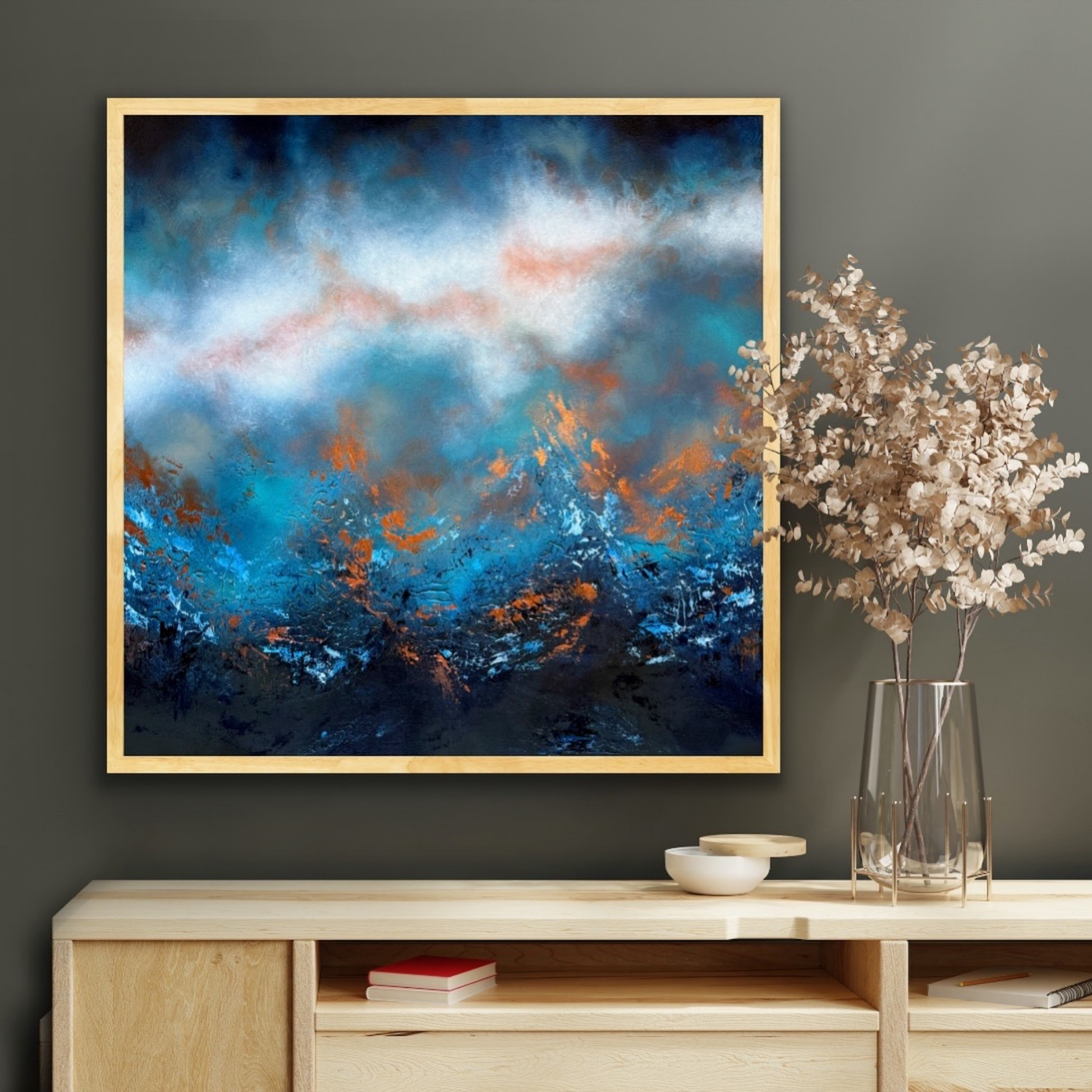 Let The Light In is an expressive and emotive work, where deep ocean blues and fiery copper tones rise into soft washes of white and sky. The textured strokes create a sense of movement and energy, as though the light itself is breaking through the darkness.