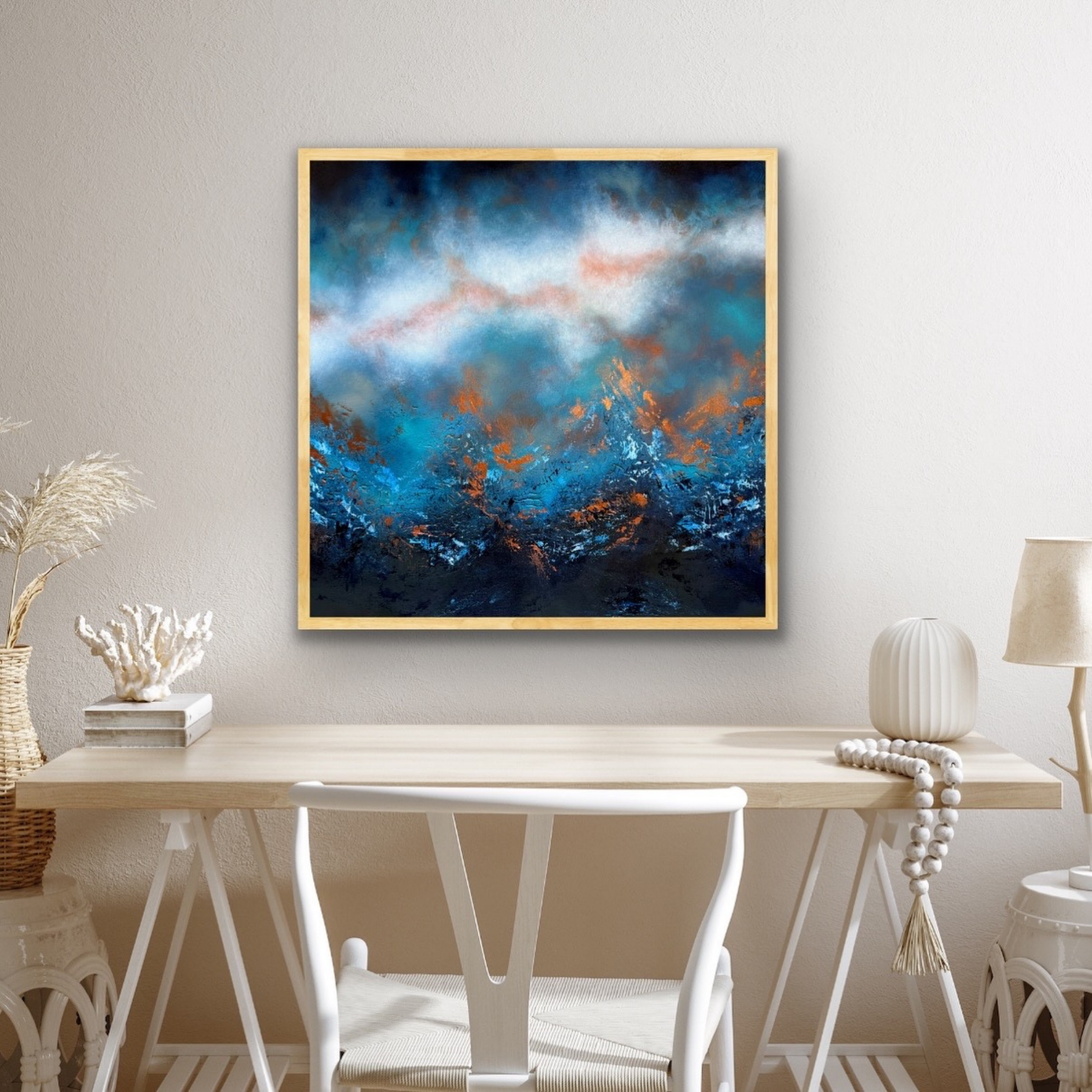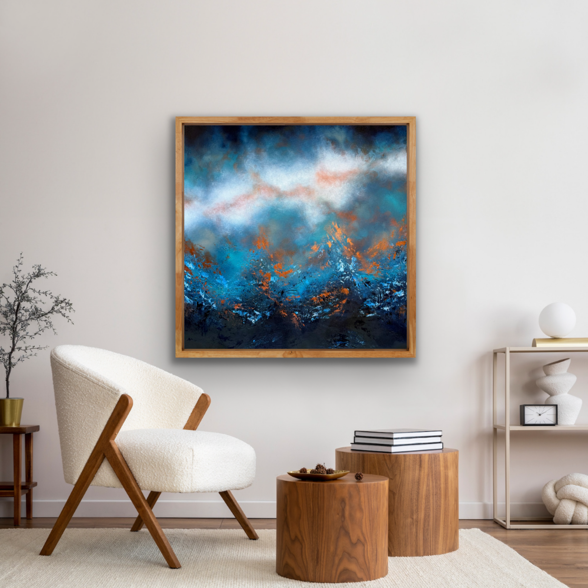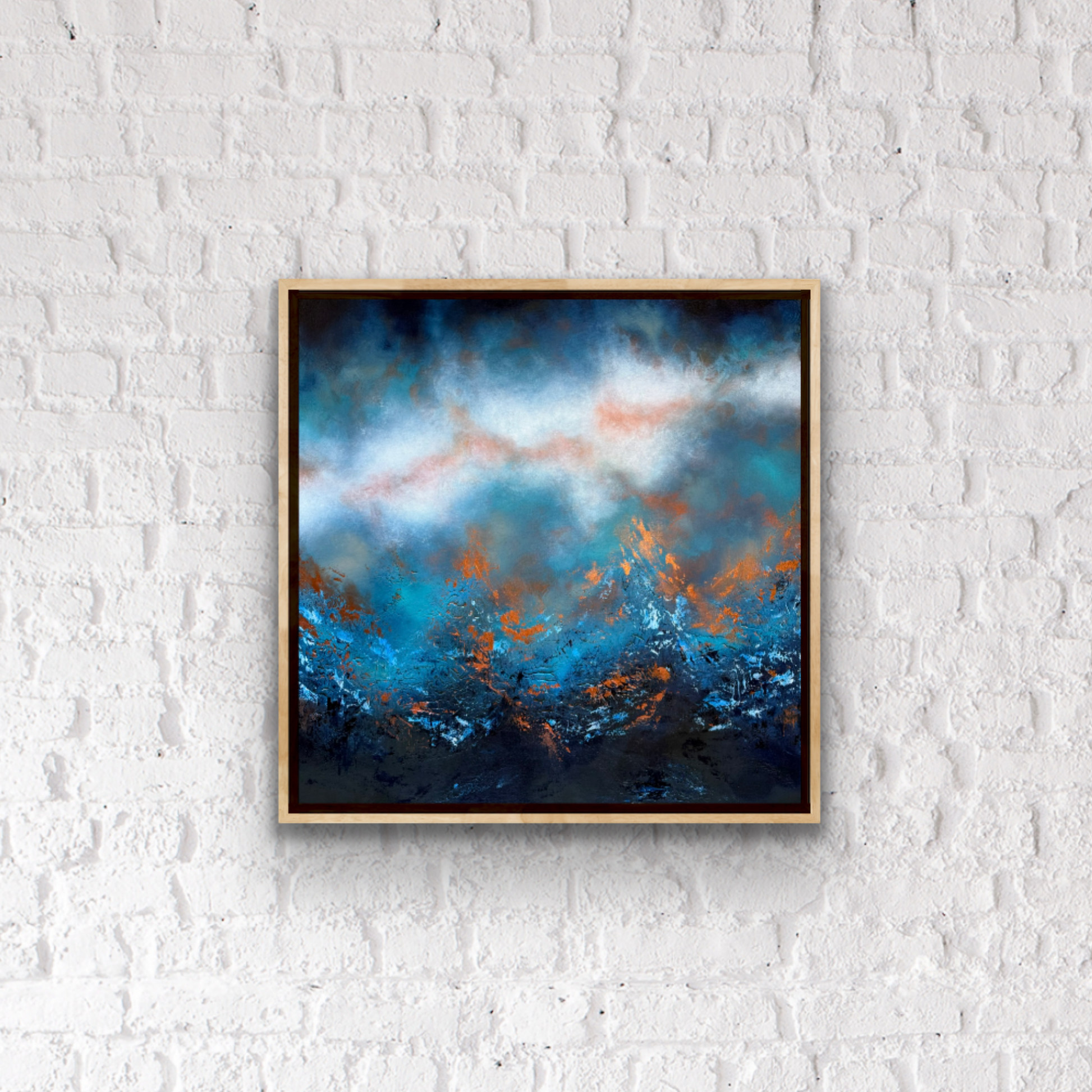 Let The Light In is an expressive and emotive work, where deep ocean blues and fiery copper tones rise into soft washes of white and sky. The textured strokes create a sense of movement and energy, as though the light itself is breaking through the darkness.